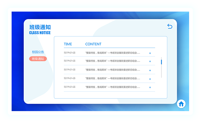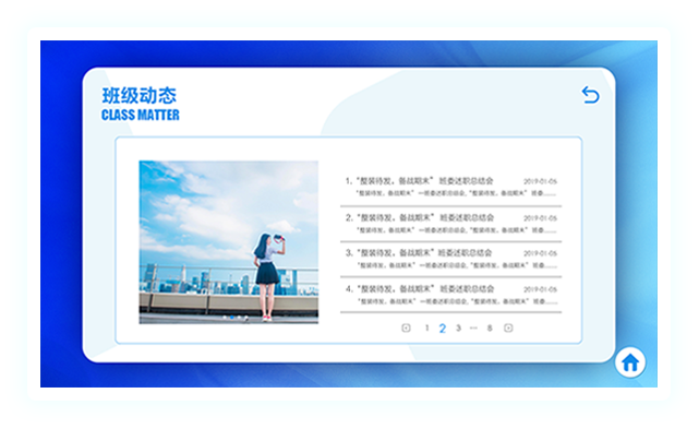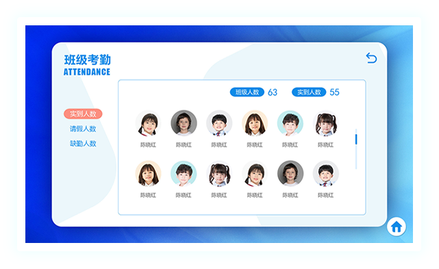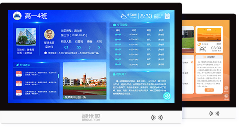 智慧班牌是以出勤管理和班級信息展示為主體,為中小學(xué)教育行業(yè)量身設(shè)計的一款集射頻卡技術(shù)、語音技術(shù)、多媒體技術(shù)、后臺管理軟件技術(shù)、智能門禁系統(tǒng)技術(shù)為一體的信息化電子產(chǎn)品。通過色彩鮮艷、友好的人機交互界面向?qū)W生傳達校園文化、集體榮譽、個人風(fēng)采,將豐富的、健康的、陽光的課余氛圍層層遞進,深入人心,對學(xué)校德育工作、減負(fù)工作均起到積極有效的作用。
